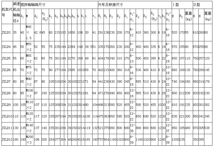 本機架系列的JXLD型適用于與XLD型擺線針輪行星減速機及CFL型行星齒輪減速機連接,JBLD型適用于與BLD型擺線減速機連接。為使攪拌軸與軸承室裝配、維修方便,本公司對軸承室結構進行改進設計,同時對與BLD2、BLD3、BLD4相配的機架JBLD2,JBLD3JBLD4的軸承室加大,使之與較粗的攪拌軸相一致。